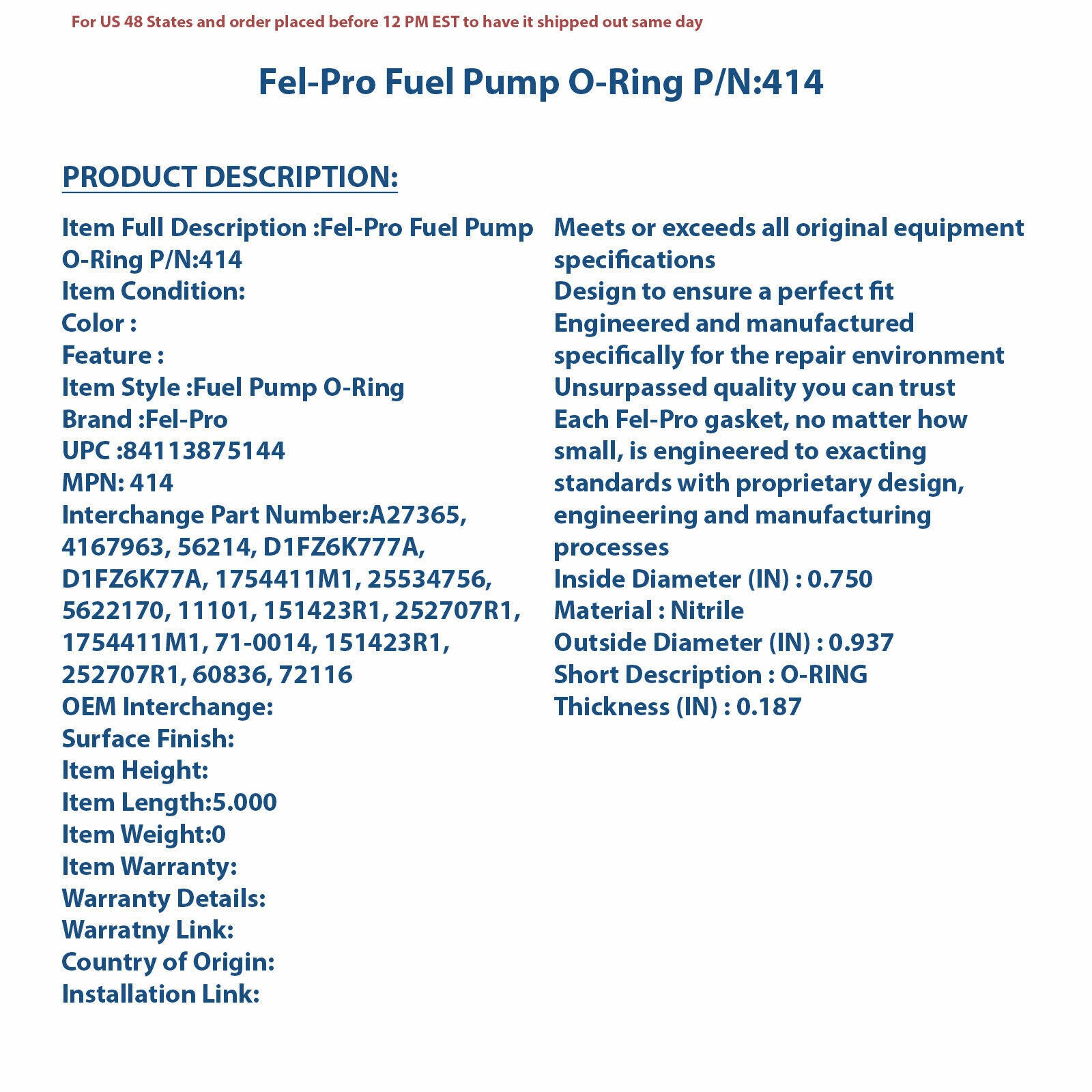 Fel-Pro Fuel Pump O-Ring P/N:414