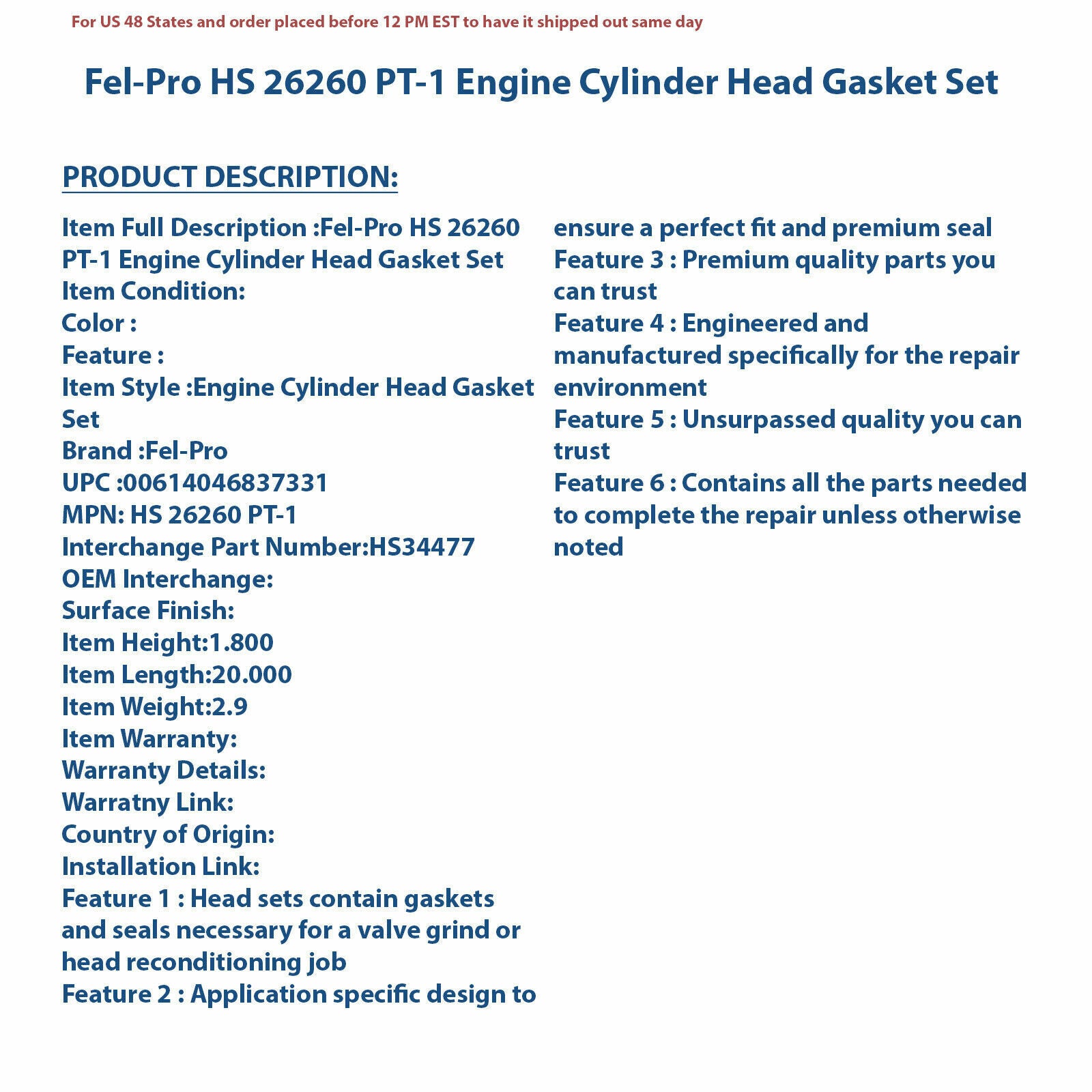 Fel-Pro HS 26260 PT-1 Engine Cylinder Head Gasket Set