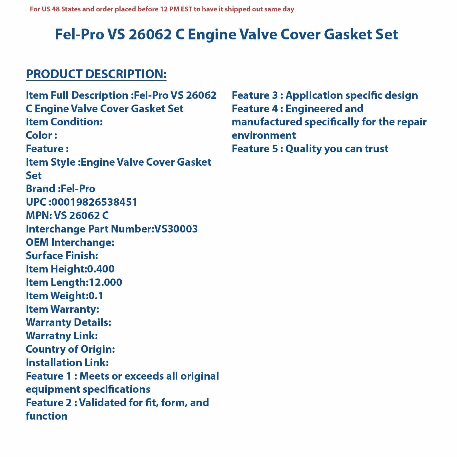 Fel-Pro VS 26062 C Engine Valve Cover Gasket Set
